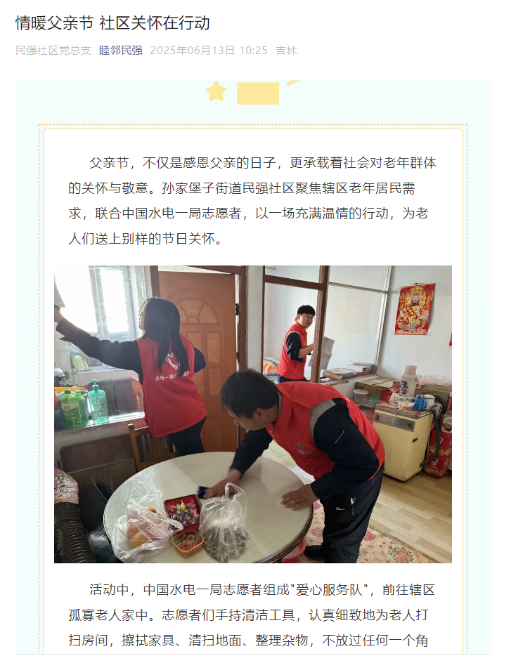 父親節,不僅是感恩父親的日子,更承載著社會對老年群體的關懷與敬意。孫家堡子街道民強社區聚焦轄區老年居民需求,聯合中國水電一局志愿者為老人們送上別樣的節日關懷。 活動中,中國水電一局志愿者組成"愛心服務隊",前往轄區孤寡老人家中。志愿者們手持清潔工具,認真細致地為老人打掃房間,擦拭家具、清掃地面、整理雜物,不放過任何一個角落。大家分工協作、干勁十足,很快就讓原本凌亂的房間煥然一新。志愿者們還與老人們親切交談,了解他們的生活狀況和實際需求,叮囑老人保重身體,讓老人們感受到親人般的關懷。 江源城市微治理,民強社區黨總支,民強社區三家公眾號進行了同步報道。 https://mp.weixin.qq.com/s/bDsMYi0P3SFxerszb2GmEg https://mp.weixin.qq.com/s/ISSVTr-27XxfWZiLmMSH2g https://mp.weixin.qq.com/s/HgV21UB936tRI9zjld8emw |