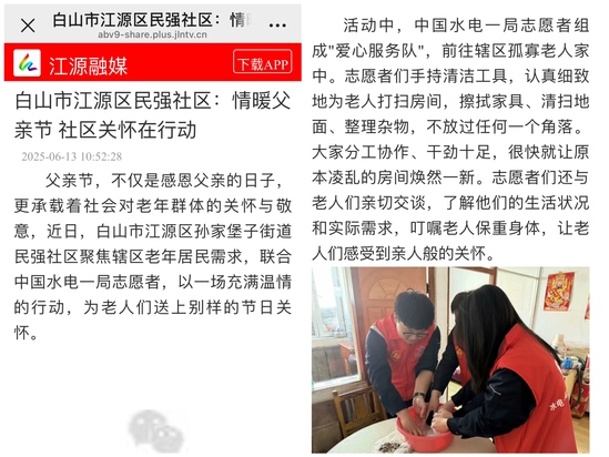父親節,不僅是感恩父親的日子,更承載著社會對老年群體的關懷與敬意,近日,白山市江源區孫家堡子街道民強社區聚焦轄區老年居民需求,聯合中國水電一局志愿者,以一場充滿溫情的行動,為老人們送上別樣的節日關懷。 活動中,中國水電一局志愿者組成"愛心服務隊",前往轄區孤寡老人家中。志愿者們手持清潔工具,認真細致地為老人打掃房間,擦拭家具、清掃地面、整理雜物,不放過任何一個角落。大家分工協作、干勁十足,很快就讓原本凌亂的房間煥然一新。志愿者們還與老人們親切交談,了解他們的生活狀況和實際需求,叮囑老人保重身體,讓老人們感受到親人般的關懷。 此次活動不僅為老人創造了整潔舒適的居住環境,更傳遞了社區對老年群體的關愛。下一步,民強社區將持續開展多樣化的惠民服務,用心用情解決居民實際需求,不斷提升居民的獲得感和幸福感。 |