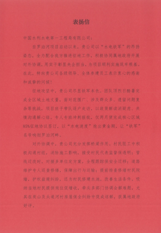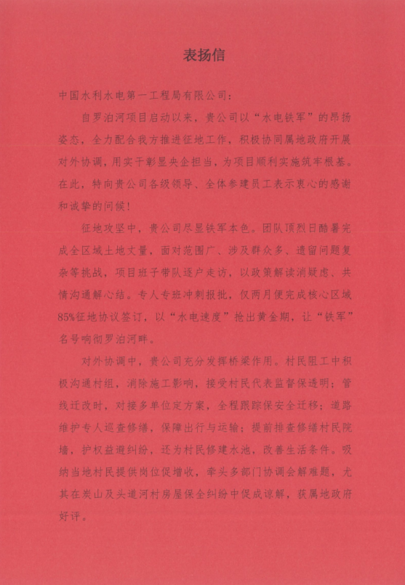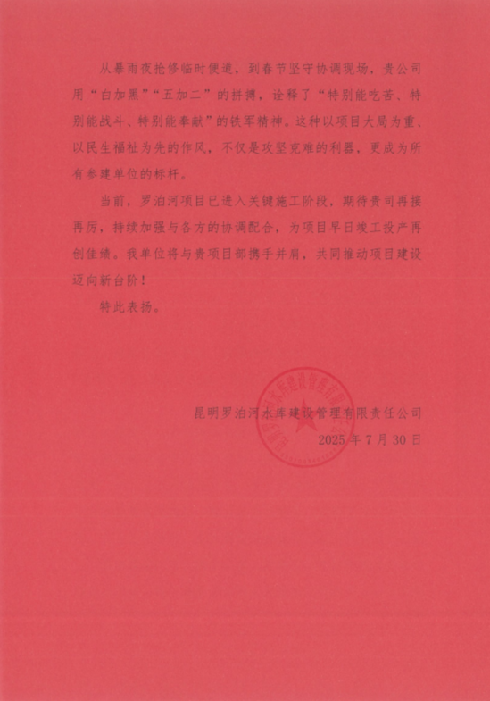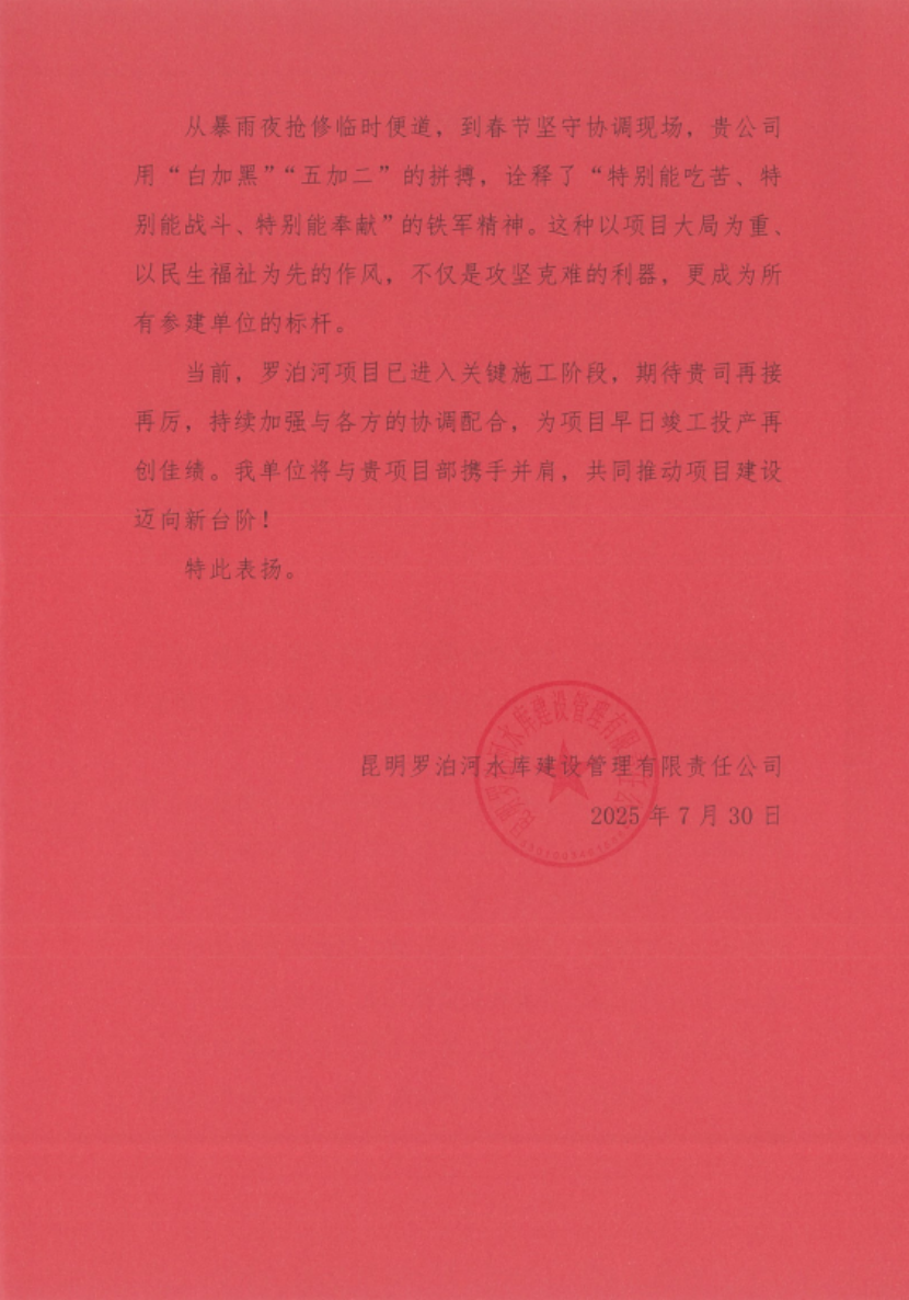 近日,昆明羅泊河水庫建設管理有限責任公司發來表揚信,對羅泊河水庫Ⅰ標引水項目部攻堅克難、保障民生方面展現出的卓越擔當與“鐵軍”風采給予高度認可和通報表揚。 征地攻堅創“水電速度” 自項目啟動以來,面對范圍廣、群眾多、歷史遺留問題復雜等巨大挑戰,項目部班子帶頭沖鋒,頂烈日酷暑完成全域土地丈量,逐戶走訪耐心解讀政策、化解疑慮。通過設立專人專班高效推進,僅用兩個月時間便完成核心區域85%以上征地協議簽訂,以令人驚嘆的“水電速度”為項目順利推進搶占了寶貴先機,業主盛贊“鐵軍名號響徹羅泊河畔”。 協調先鋒筑“民心橋梁” 項目部充分發揮紐帶作用,積極化解施工矛盾:村民阻工時,主動溝通村組、接受監督確保透明;管線遷改中,高效對接各方、全程跟蹤保障安全;道路維護專人巡查,確保通行無阻。更將民生關懷落到實處——主動修繕村民院墻避免糾紛,修建便民水池改善生活,積極吸納當地村民就業增收。尤其在炭山、頭道河村房屋保全糾紛中,項目部積極斡旋促成多方諒解,其專業高效的協調能力贏得屬地政府高度評價。 鐵軍精神顯“實干本色” 從暴雨夜緊急搶修保通臨時便道,到春節期間堅守協調一線,項目部全體成員以“白加黑”“五加二”的拼搏姿態,生動詮釋了“特別能吃苦、特別能戰斗、特別能奉獻”的水電鐵軍精神。業主在信中特別指出,這種“以項目大局為重、以民生福祉為先”的過硬作風,已成為全體參建單位的學習標桿。 當前,羅泊河水庫項目已進入關鍵施工期。這份沉甸甸的表揚信,既是對我們Ⅰ標引水項目部全體人員辛勤付出的最大肯定,更是催征的戰鼓。項目部將珍惜榮譽,再接再厲,緊密協同業主及各參建方,以更高標準、更實作風全力沖刺后續工程節點,為羅泊河水庫早日建成、造福春城再立新功! |