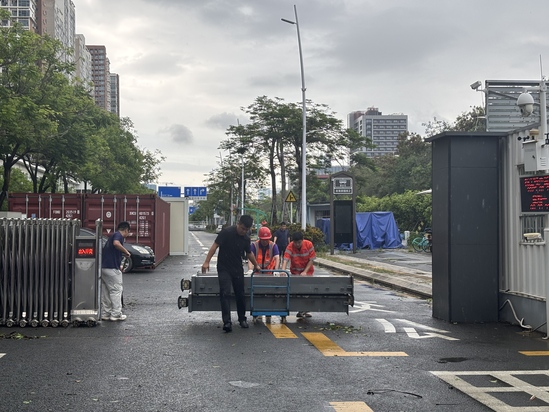 臺風過境后的項目營地像被翻攪過的棋盤。折斷的樹枝橫在主干道中央,積水在低洼處晃出細碎的波紋,幾處圍擋被掀成鈍角。清晨8點,項目部的清理工作就已開始,車斗里的鐵鍬和高壓水槍碰撞出清脆的聲響。“各組注意,按預定方案行動!”管理人員的喊話帶著沙啞,卻讓四散分布的隊伍瞬間凝成合力。